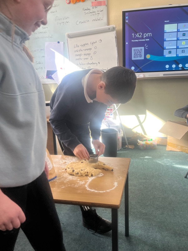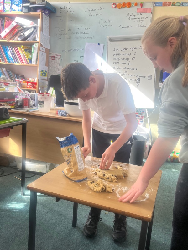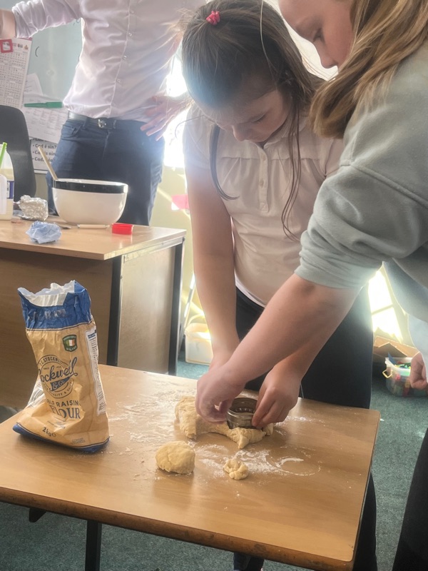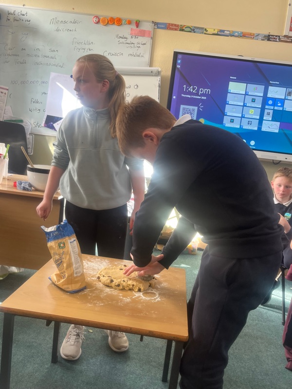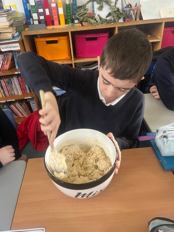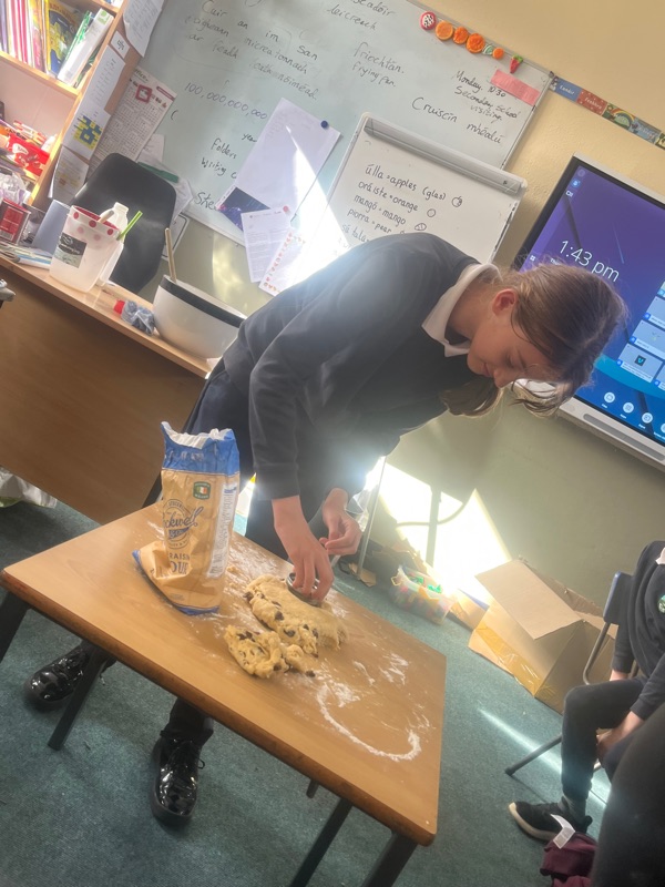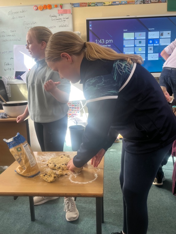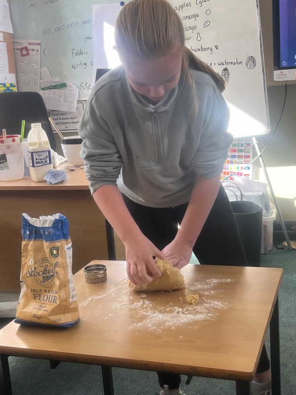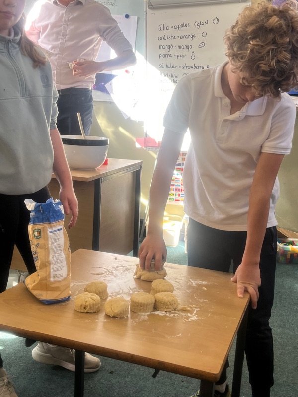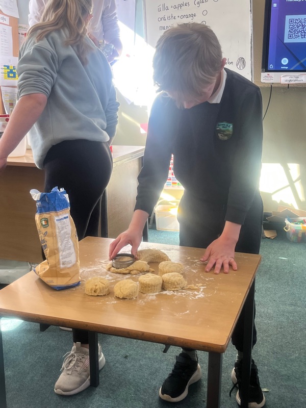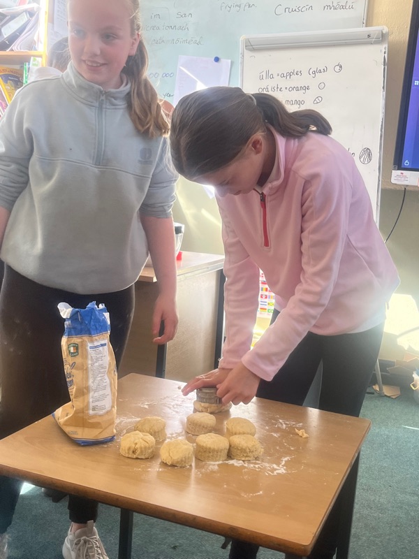 We also made scones. Clodagh and Mr.Coakley made the batter and the rest of the room cut out the scones with the scone cutter. Then we cooked them next door in Kaitlin’s. It was fun. Mr Coakley gave us all a scone each. We all loved them. We hope we can do it again. Clodagh has typed the recipe and we are looking forward to trying them at home.