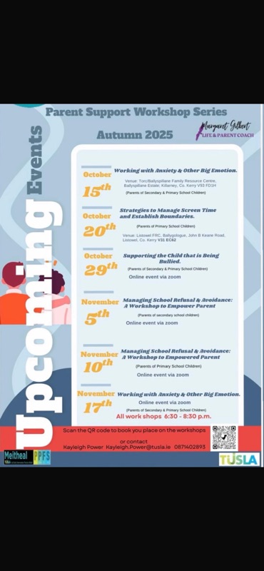 Parents…Please check out the schedule of Free supportive workshops that are available in Kerry or online over the coming weeks.