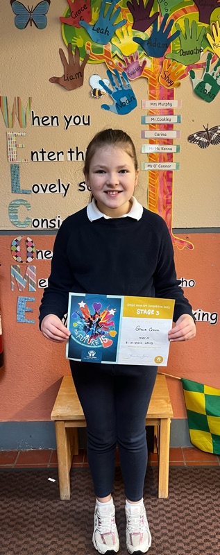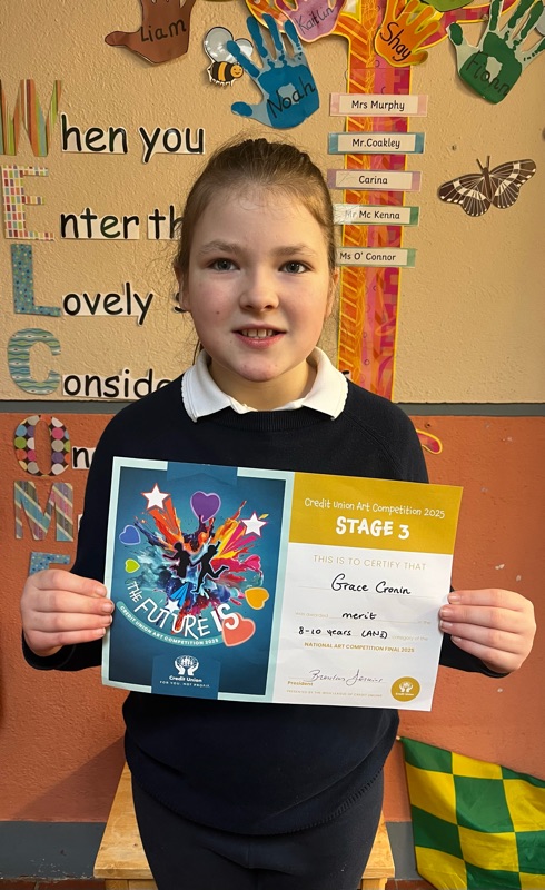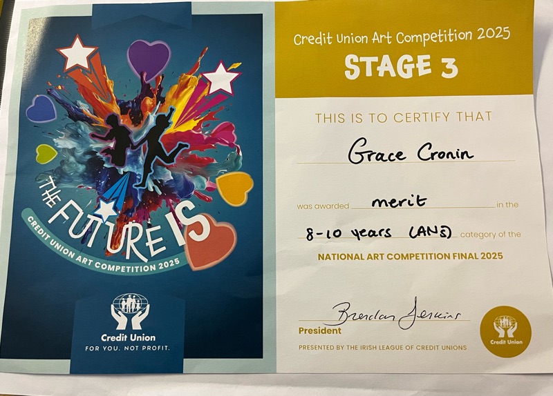 Huge congratulations to Grace, who received a Merit Award in the 8–10 age category at the Credit Union Art Competition National Finals 2025 in Dublin at the weekend.