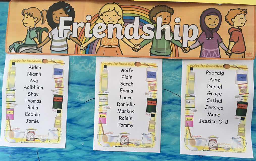 Group B were working with Friends. The group worked in pairs or in groups of three with a new friend to make picture frames from lollipop sticks. While working they listened to some of their favourite songs and had a chat to find out a bit more about their new friend. When the frames were finished they took part in the friend quiz, they had to answer questions about each other. Everyone did very well and learned lots about each other.