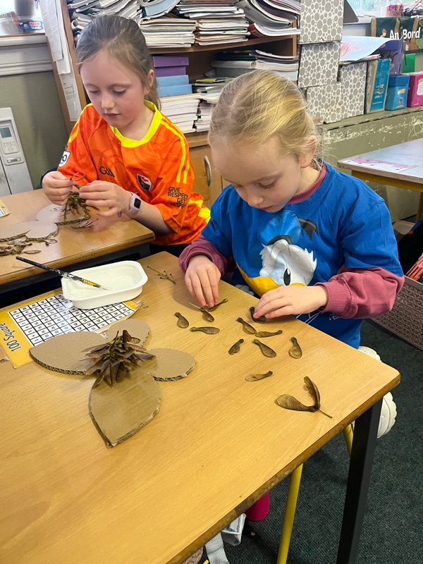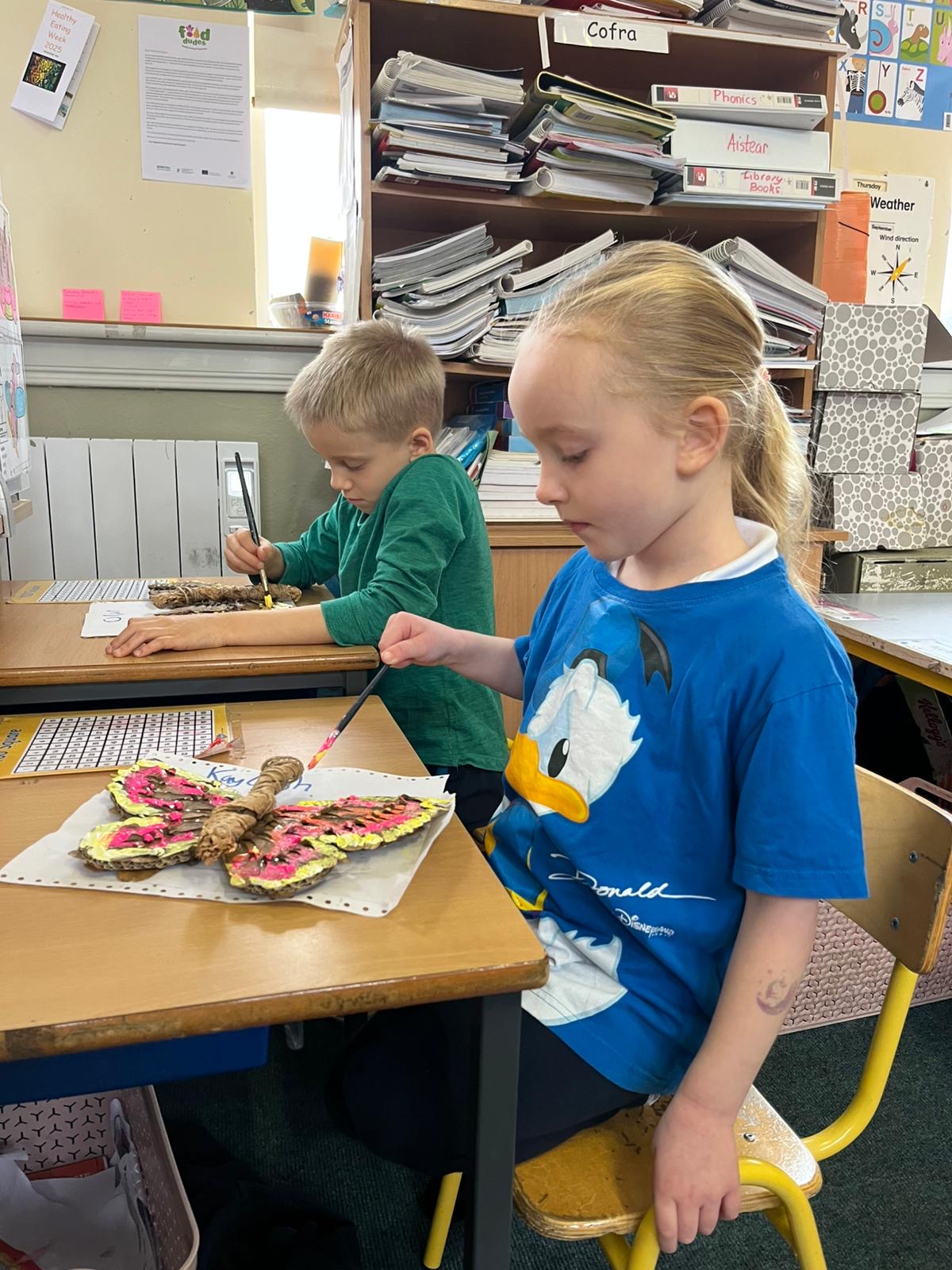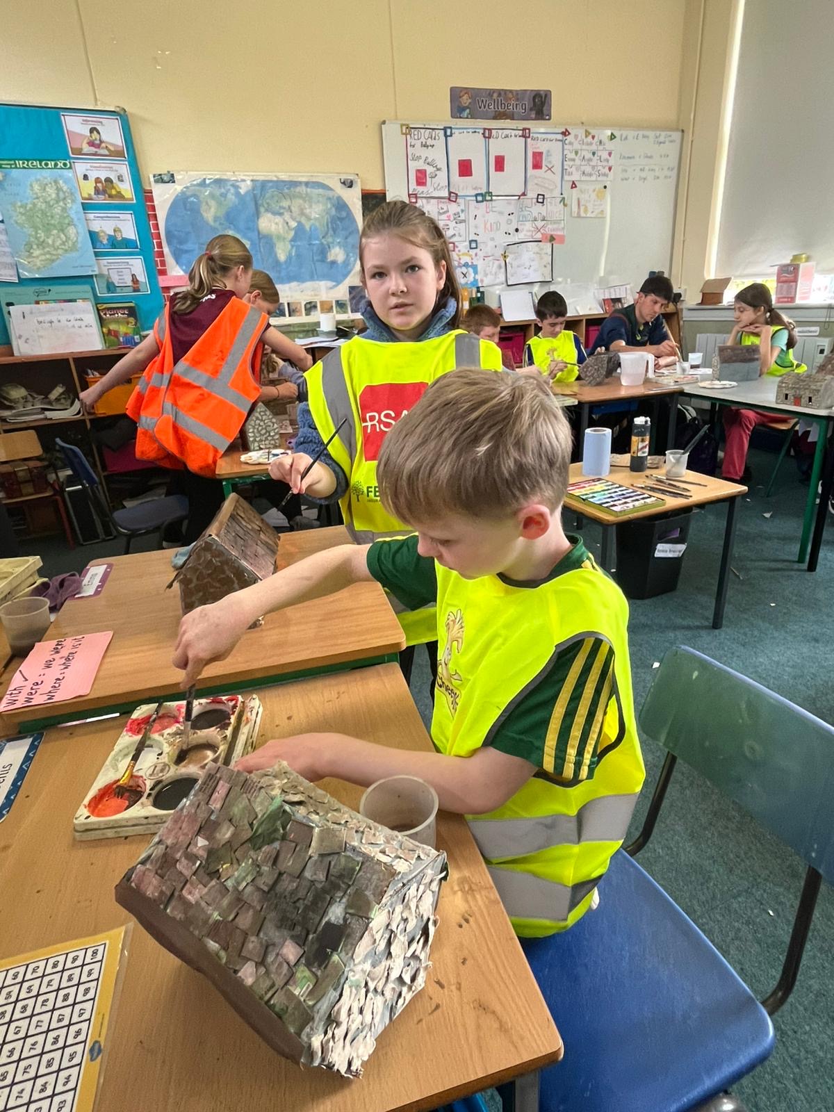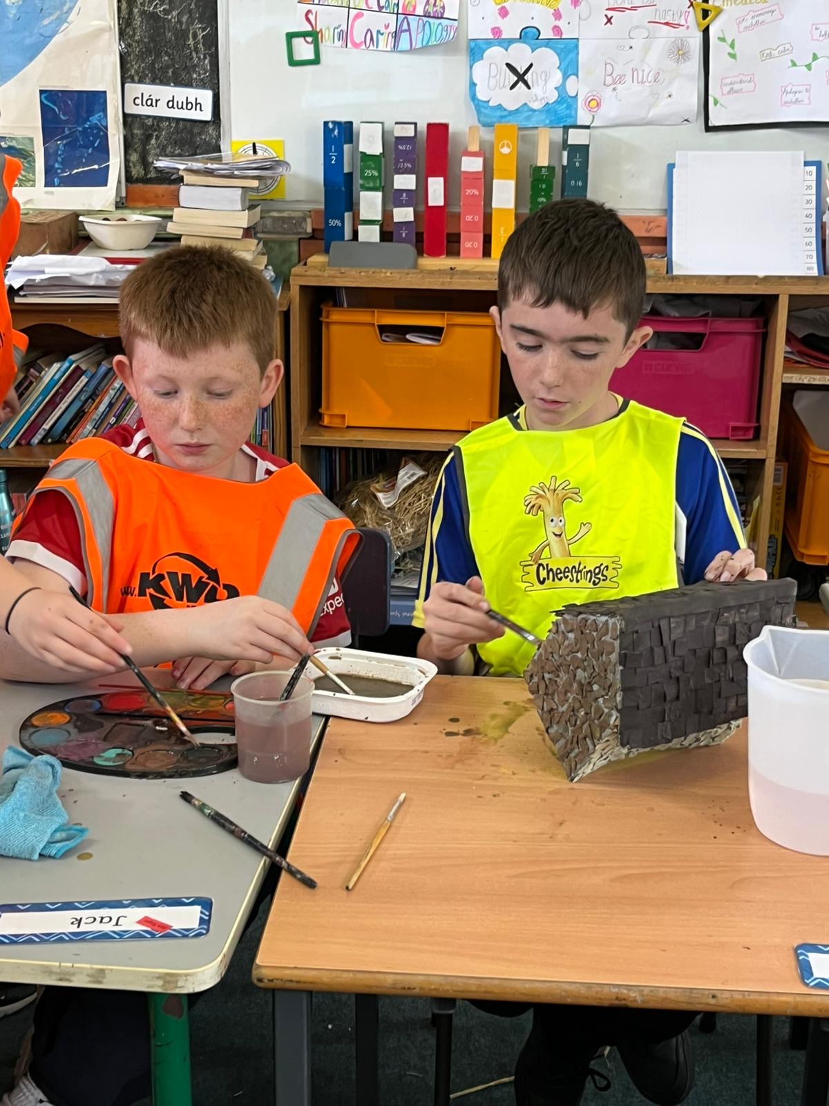 The junior room pupils worked on the theme of the forest whilst the senior pupils went back in time and they worked on dwelling houses from fadó, fadó.