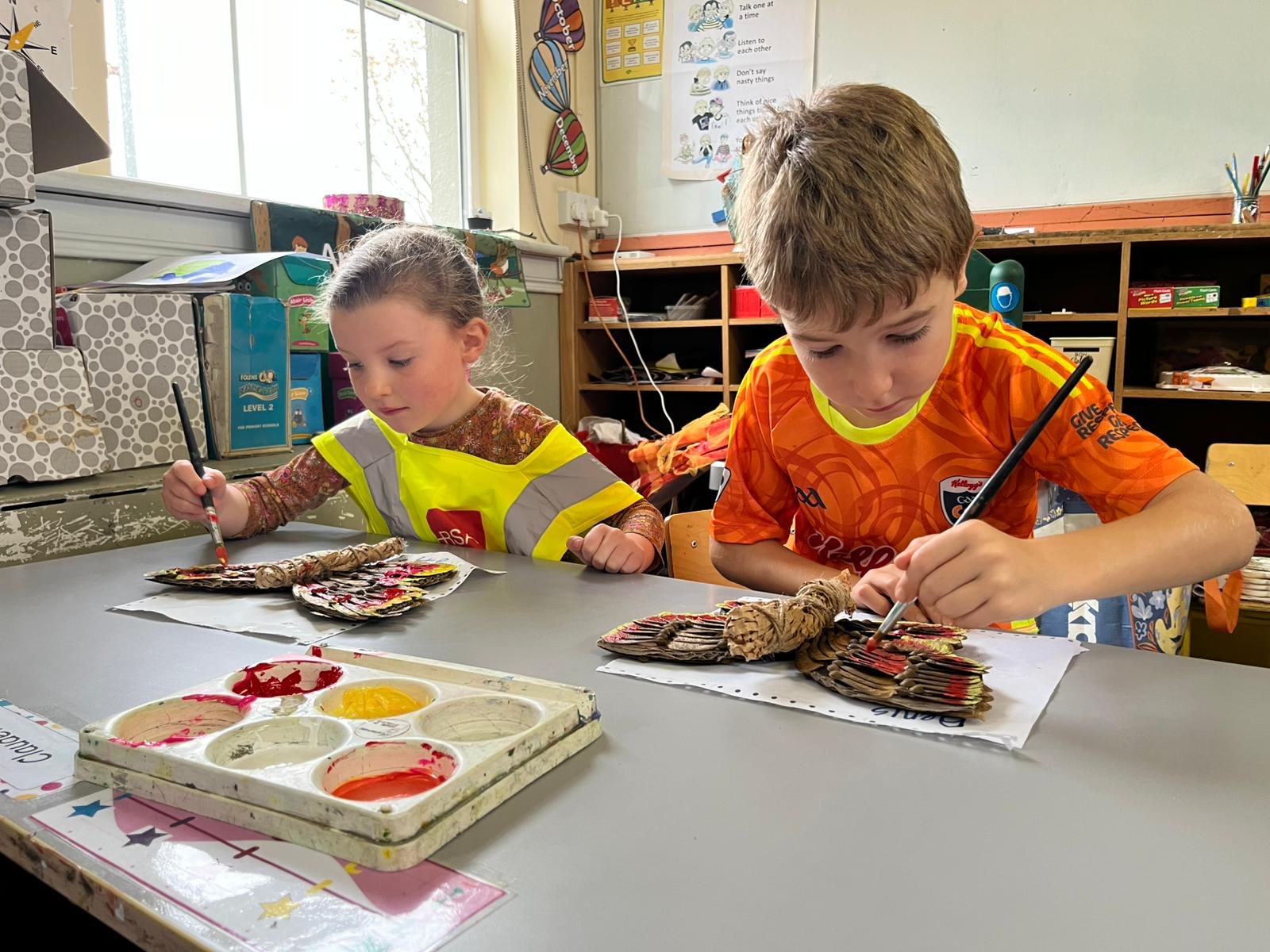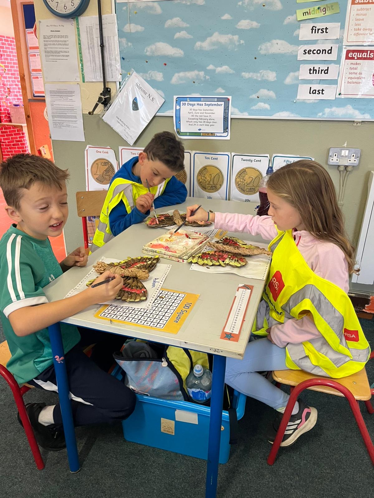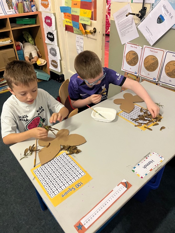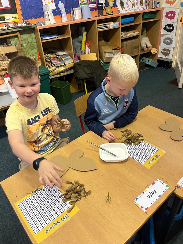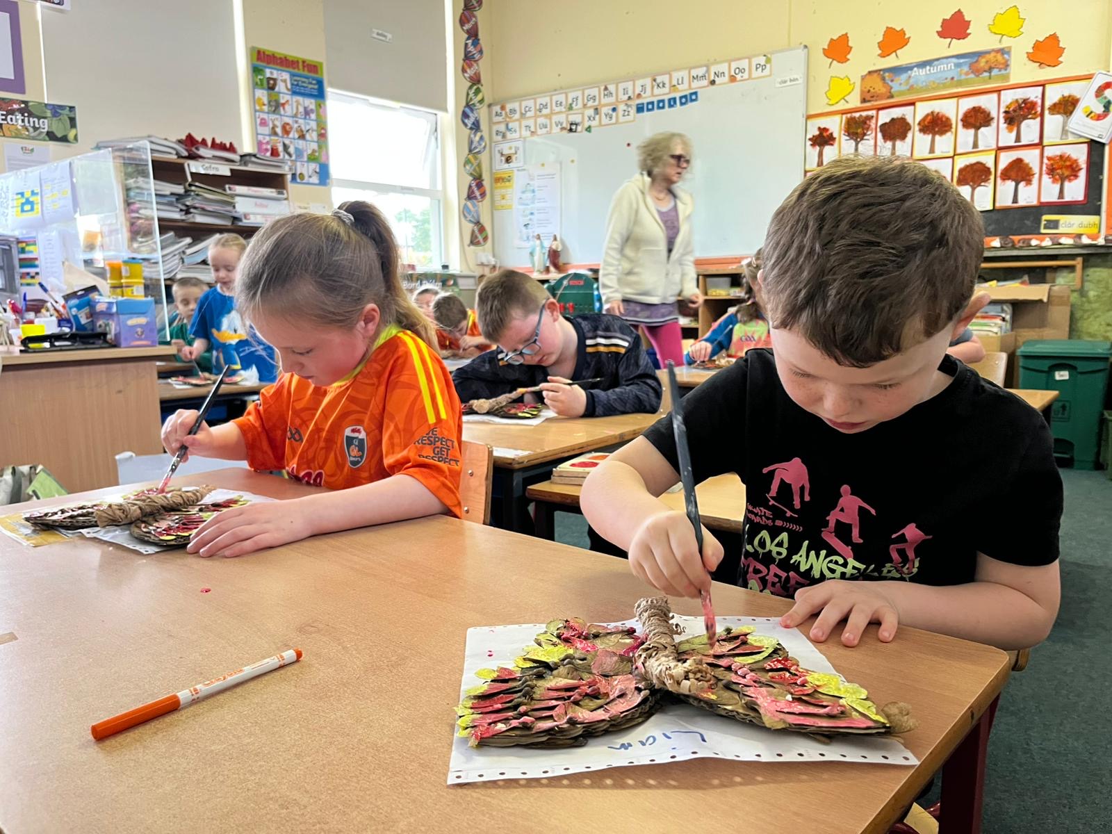 The junior room pupils worked on the theme of the forest whilst the senior pupils went back in time and they worked on dwelling houses from fadó, fadó.