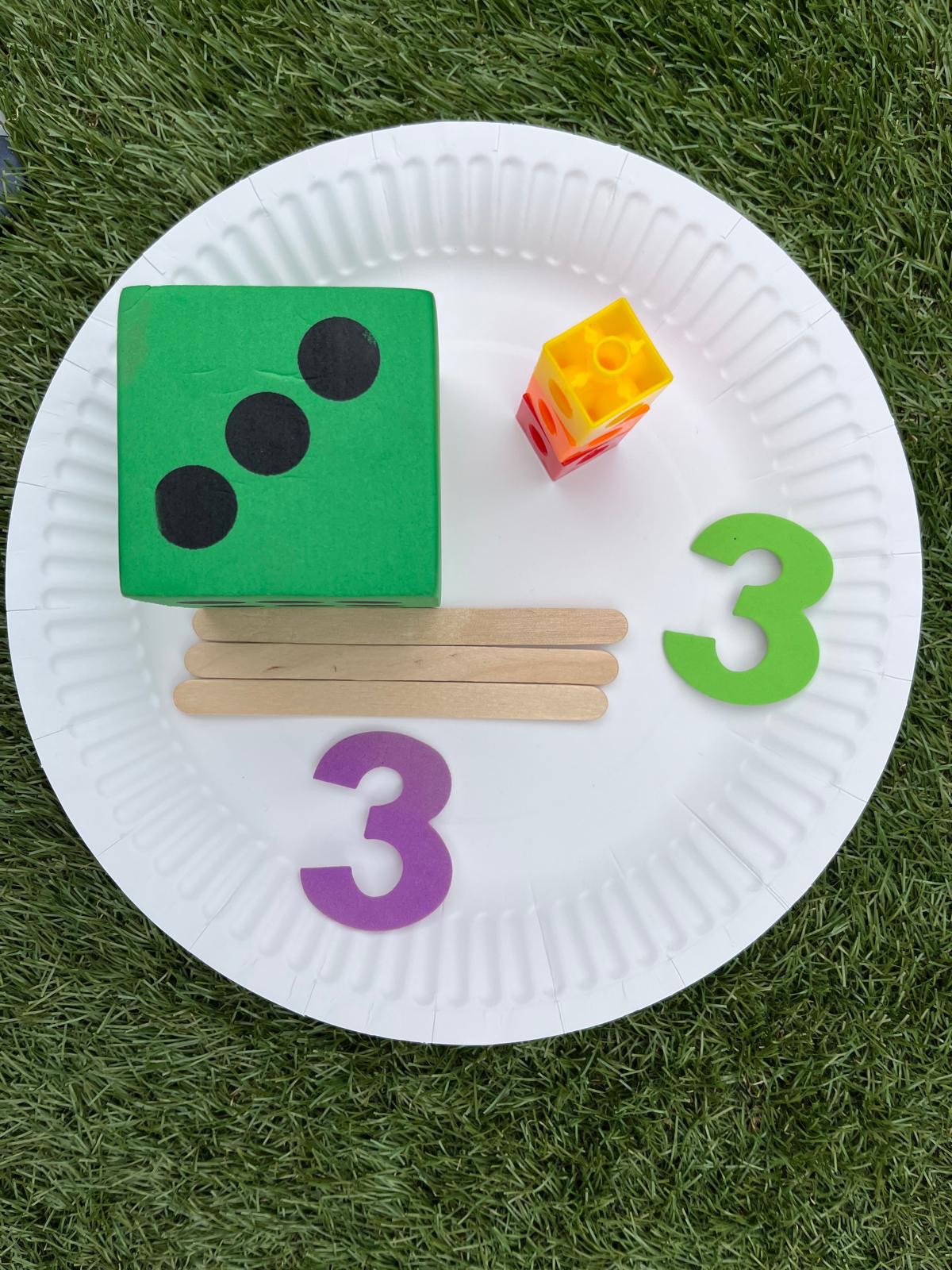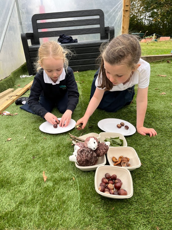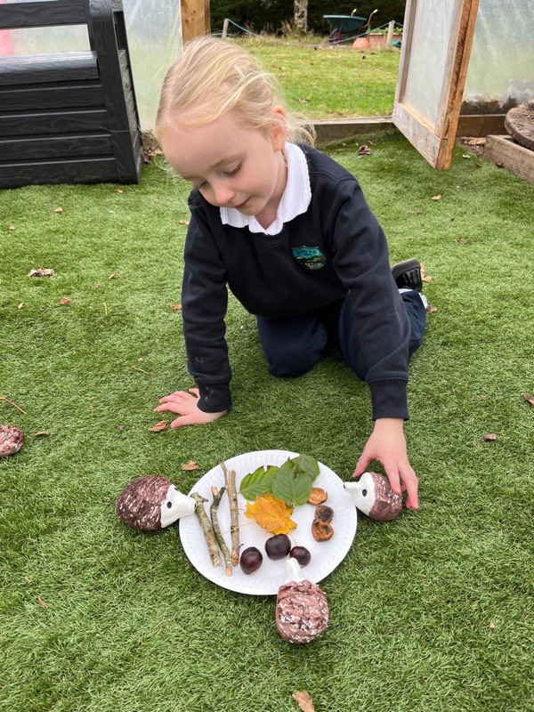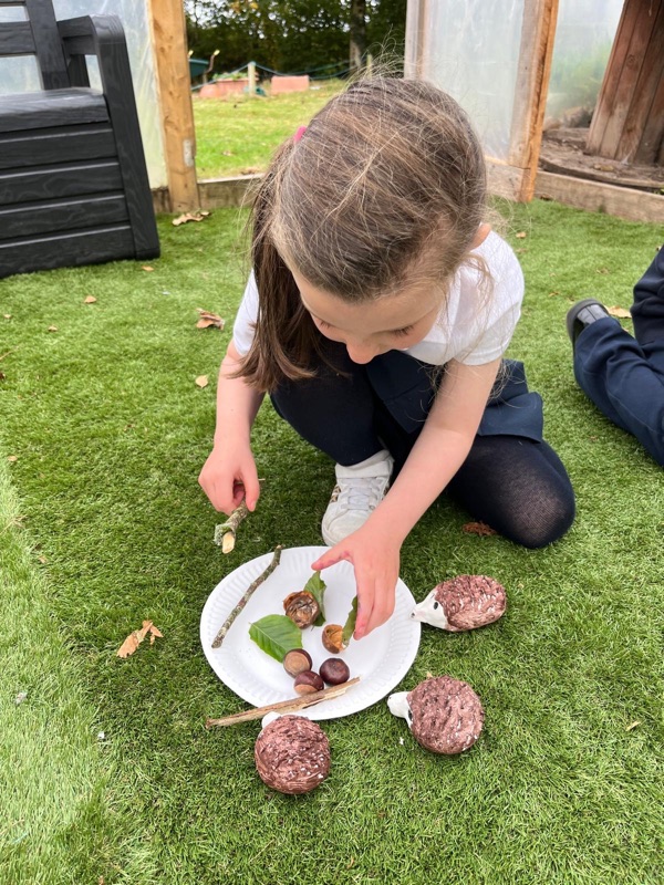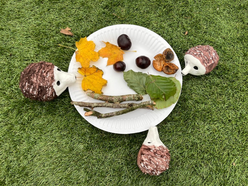 3 hedgehogs were invited to dinner. They ate 3 sausages (sticks), 3 potatoes (horse chestnuts)etc.